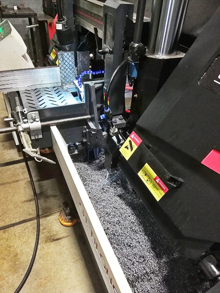 Метод гидроабразивной резки более затратный, чем раскрой на ленточнопильном станке. Поэтому на гидроабразивном станке давальческий материал (плиты 1500х3000 мм) разрезали на 3 полосы по 500 мм. Далее к решению вопроса подключили ленточную пилу.