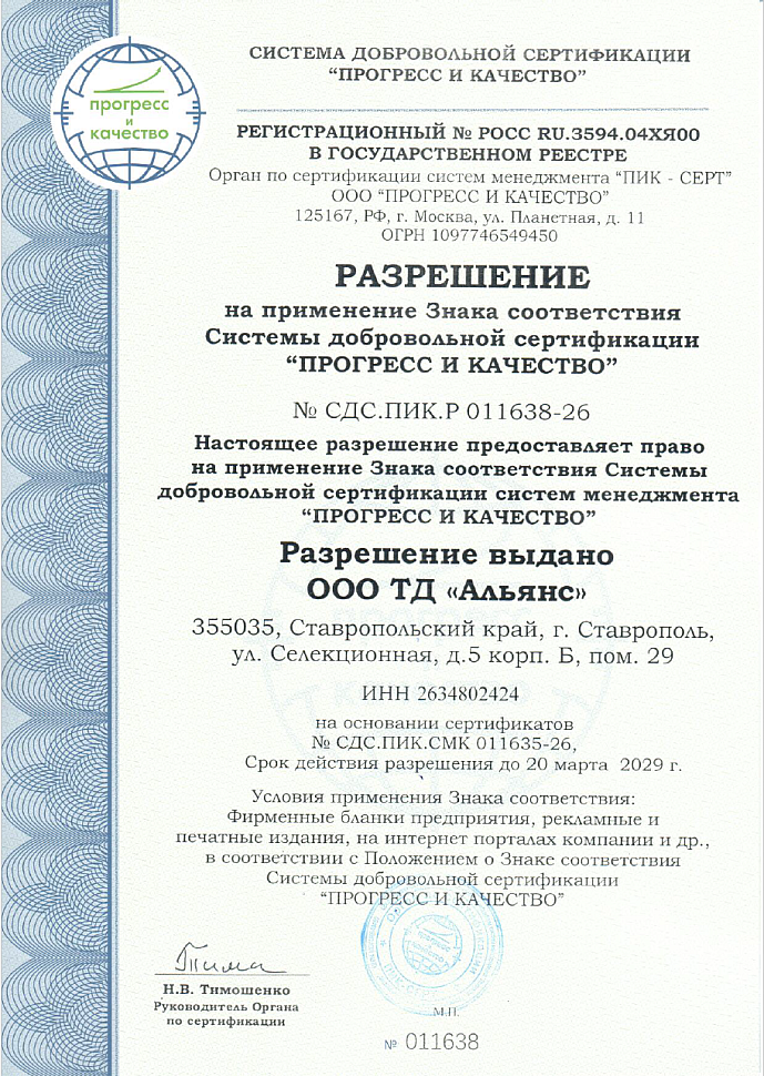 В компании успешно внедрена система менеджмента качества в соответствии с требованиям ГОСТ Р ИСО 9001-2015 (ISO 9001:2015) применительно к производству и поставке узлов механизмов, запасных частей к ним, изделий из металлических сплавов и пластика для различных отраслей промышленности согласно Общероссийскому классификатору видов экономической деятельности (ОКВЭД 2):